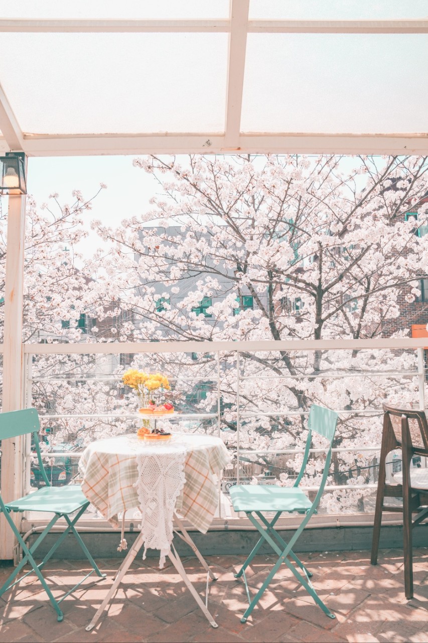 루프탑이 있어서 벚꽃뷰를 여기서 감상하실 수 있는데요. 루프탑은 소문난 벚꽃 명당으로 인기가 대단한 자리입니다.