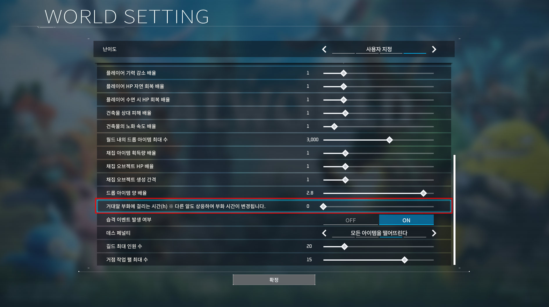 팔월드는 생존을 위해 자원을 채집해야 하는 시스템인데요. 초반 드롭률 세팅을 통해 이런 과정에 대한 피로도를 줄일 수 있습니다.