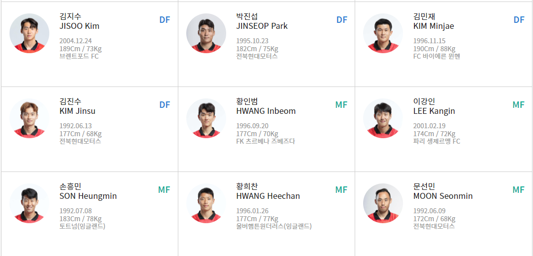 26명의 자랑스러운 대한민국 축구대표팀 명단입니다.